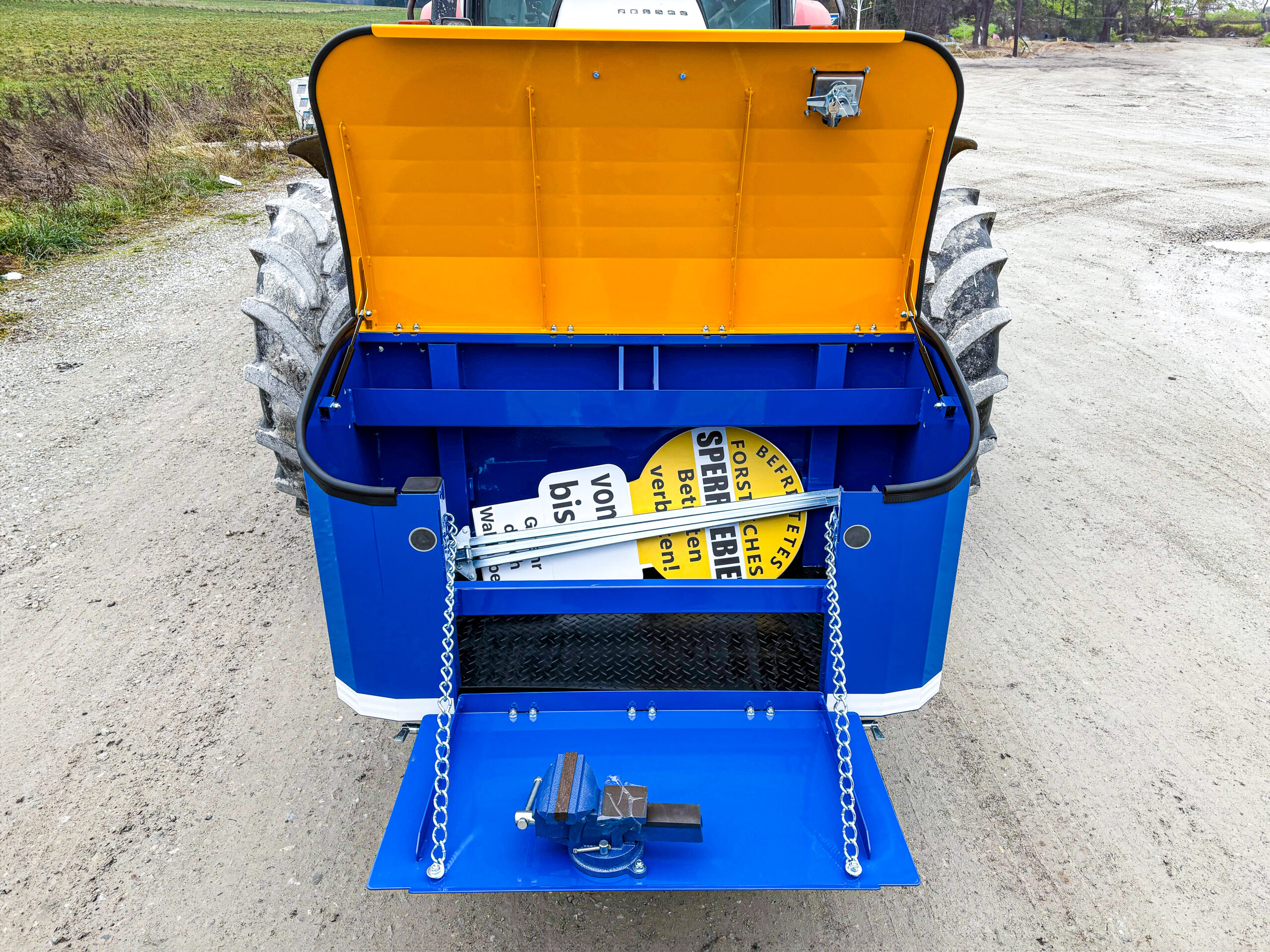 Unsere stabile und komfortable Forstbox sorgt für den sicheren Transport Ihres Werkzeugs und erleichtert somit Ihre Arbeit erheblich. Der pulverbeschichtete oder verzinkte Grundkörper und Deckel überstehen auch härtere Beanspruchungen im privaten oder gewerblichen Einsatz. Die Forstbox Professional schützt Ihr Hab und Gut nicht nur vor Umwelteinflüssen, sondern ist auch mit einem Schloss gegen Diebstahl gesichert. Des Weiteren können Sie mit Hilfe der zwei verbauten Gasdämpfer den Deckel ganz leicht öffnen. Die ausziehbaren Füße mit zwei gebremsten Rollen verschaffen Ihnen eine angenehme Arbeitshöhe. Der serienmäßige Schraubstock und die ausklappbare Werkbank erleichtern Ihre Arbeit zusätzlich. Optional kann die Transportbox mit einer Motorsägenhalterung ausgestattet werden – so haben Sie immer alles griffbereit.