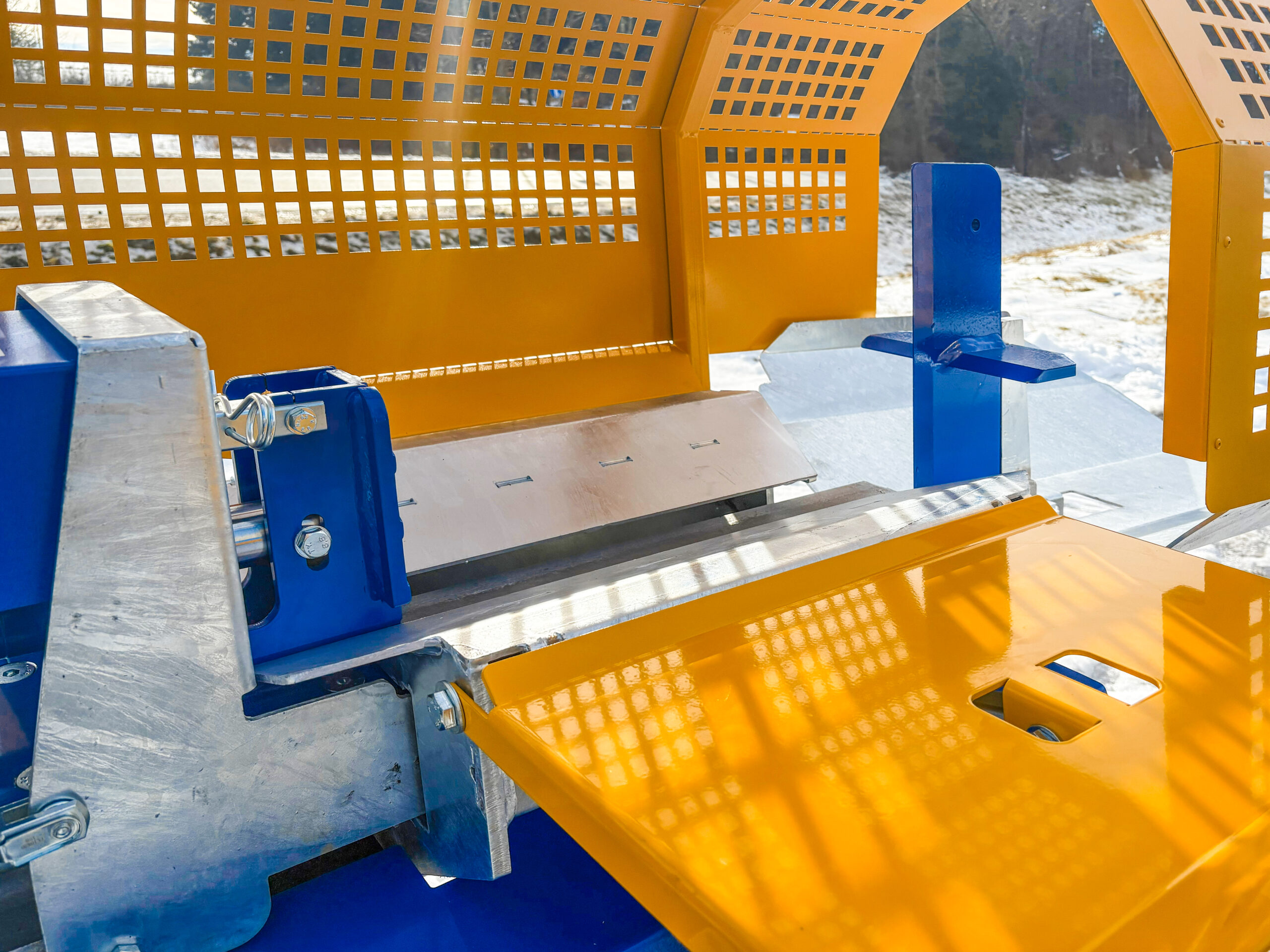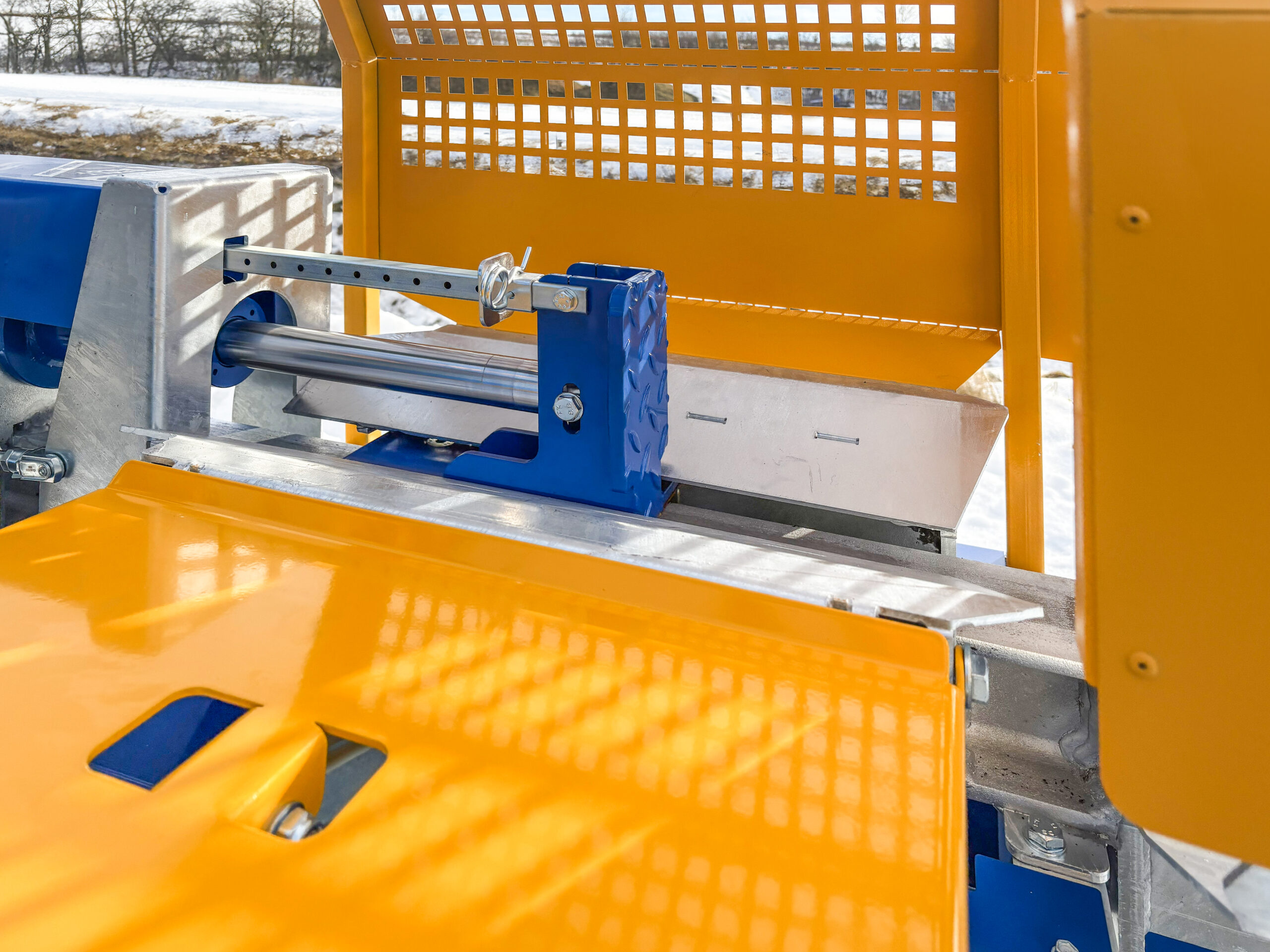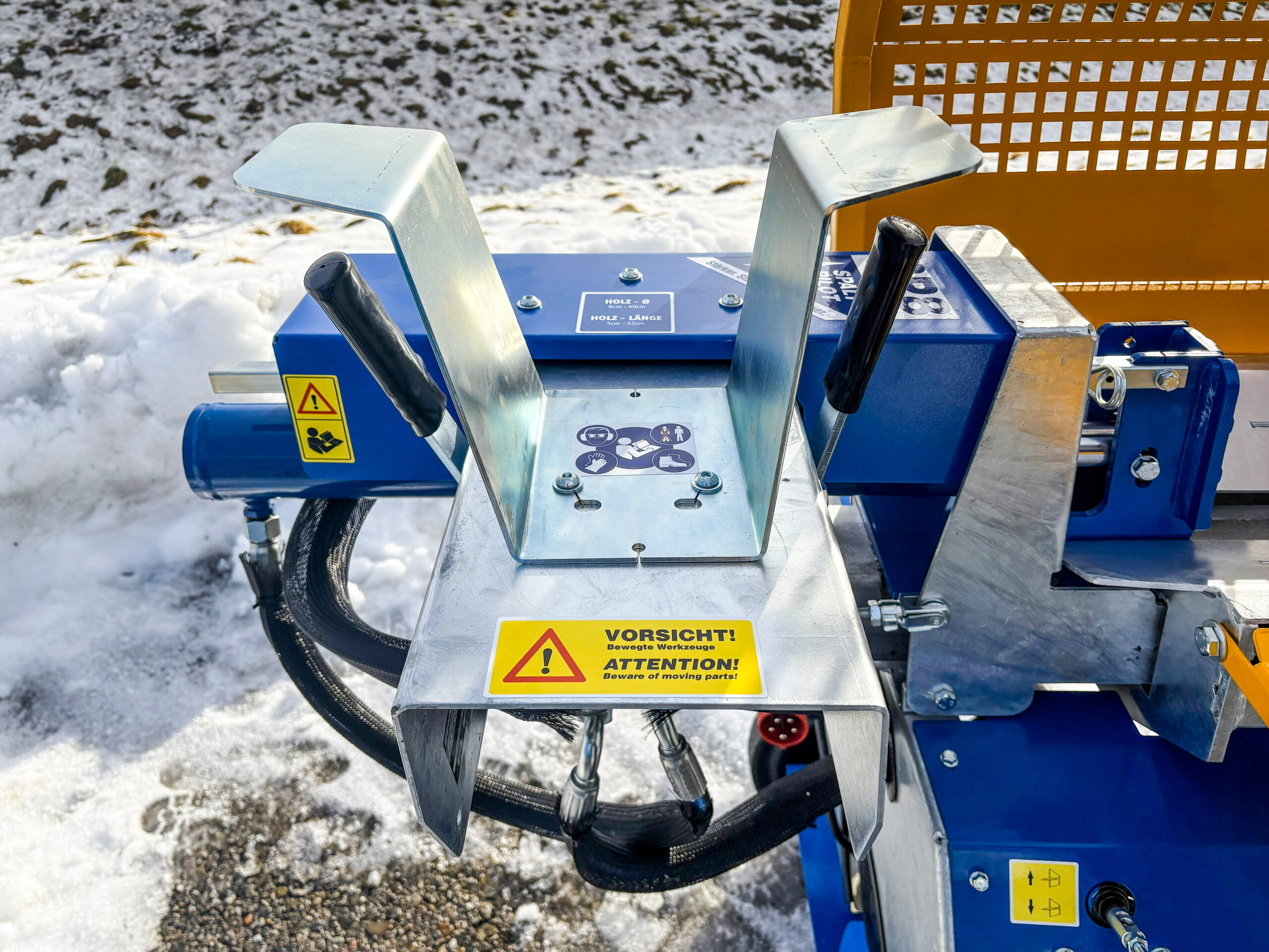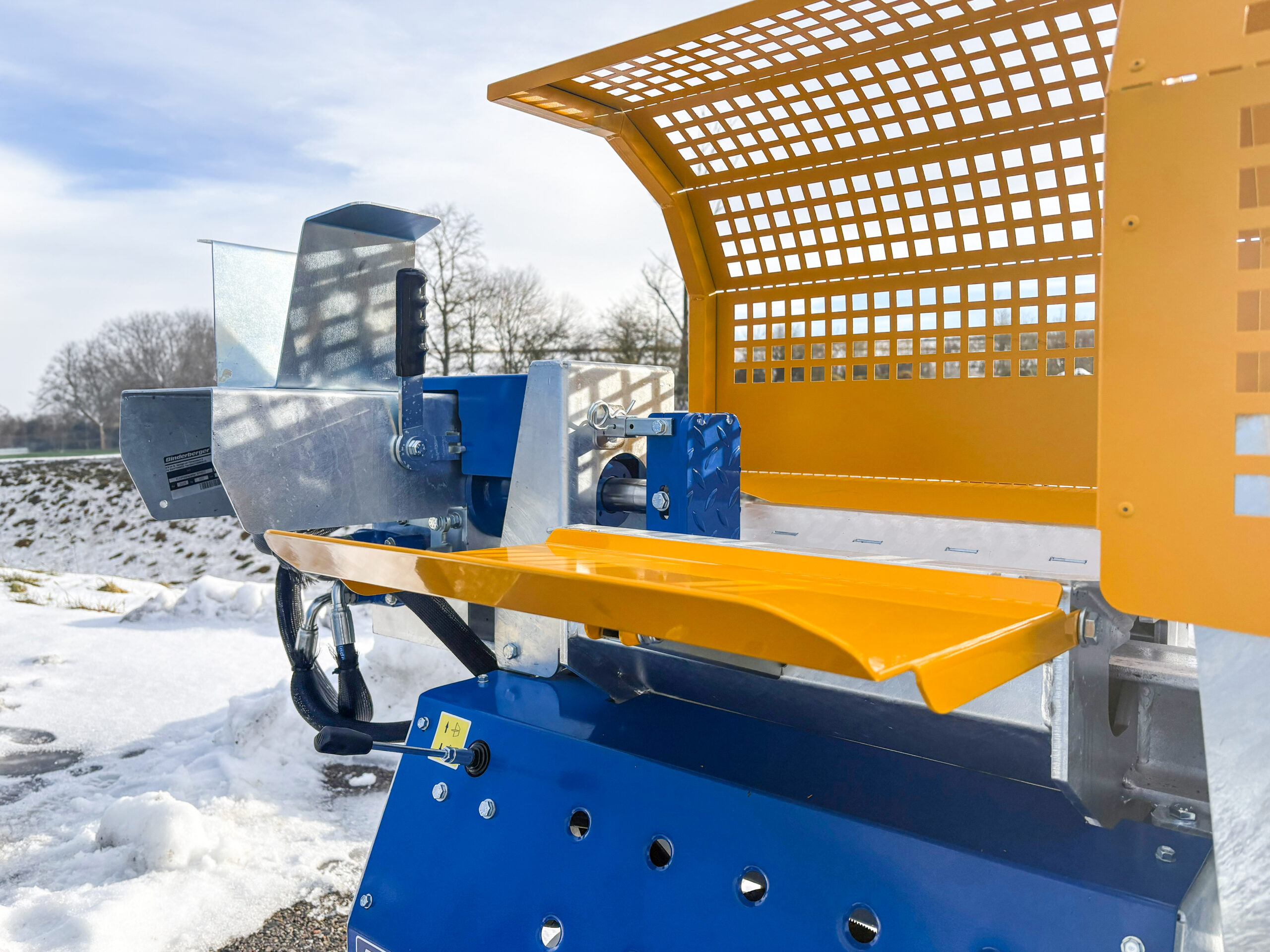 Durch die liegende Bauweise werden der Arbeitskomfort und die Sicherheit erheblich erhöht. Mit 8t Spaltkraft  erhältlich, wird das Holz durch das serienmäßige höhenverstellbare 4-fach Spaltkreuz gedrückt, wonach es auf der ausgeklappten Holzablage liegen bleibt. Damit das Spaltkreuz unseres Kurzholzspalter liegend keinen unnötigen Leerweg bis zum Anschlag fahren muss, ist der Hubweg begrenzbar und an die Brennholzlänge anpassbar.