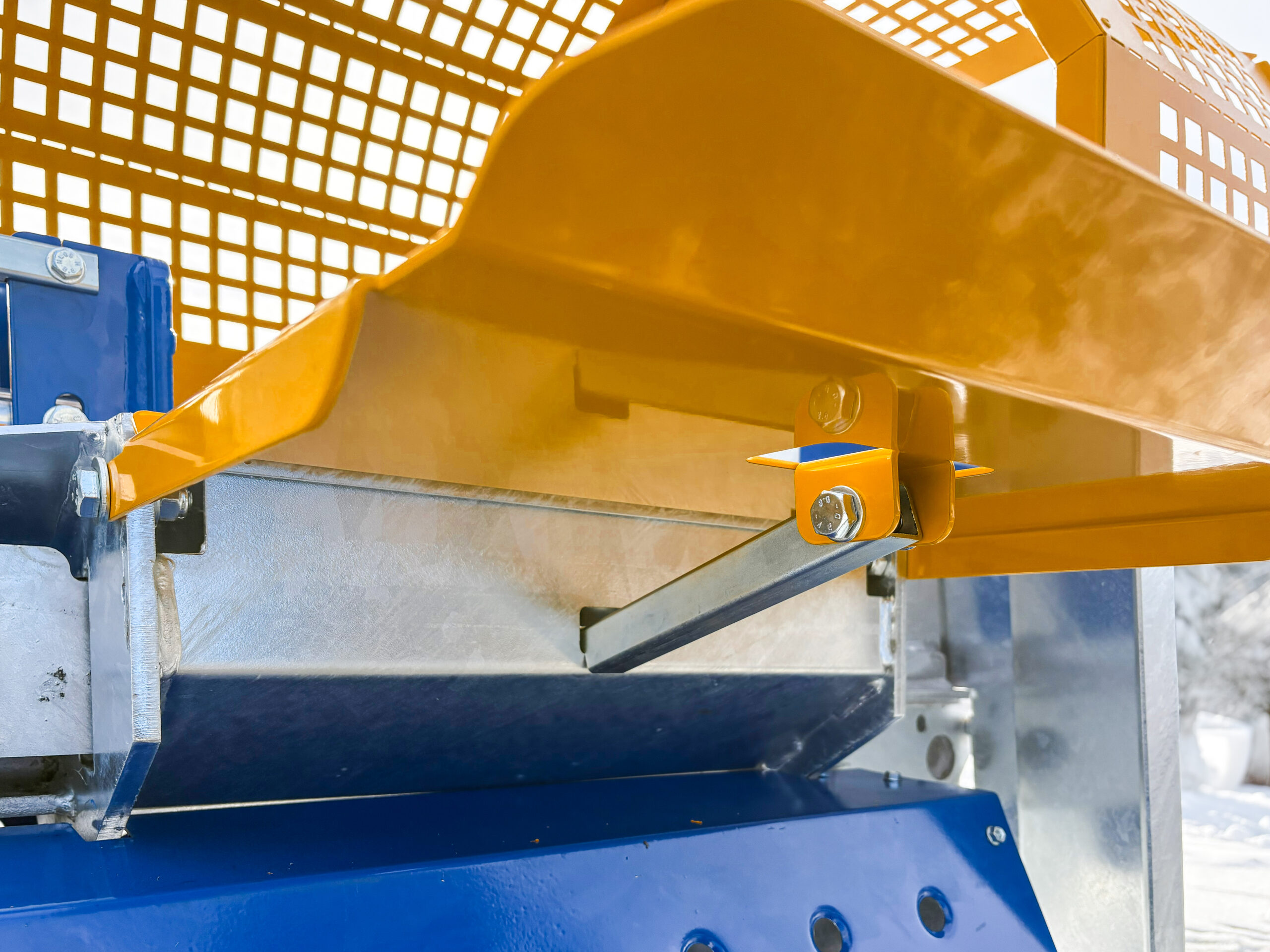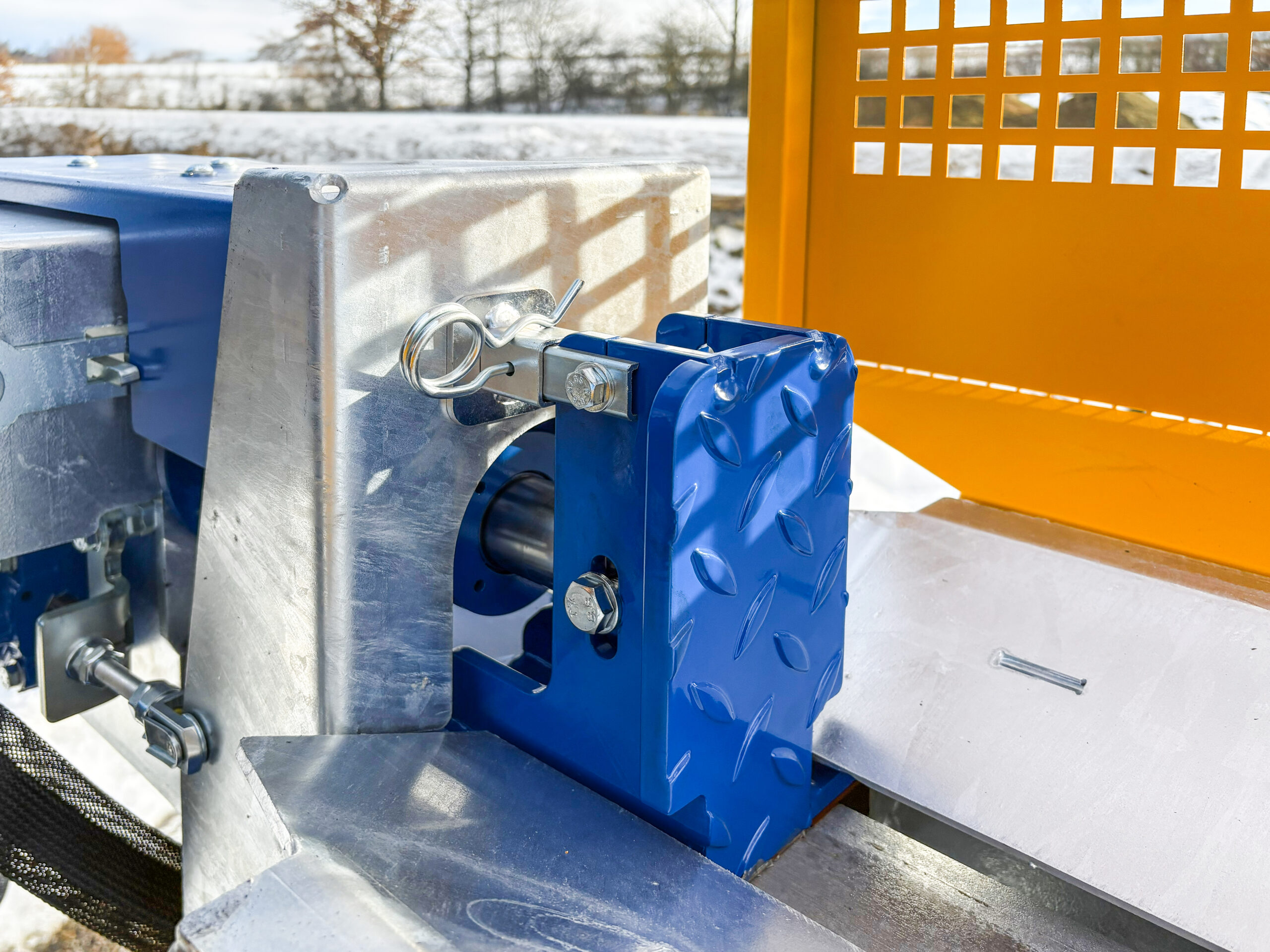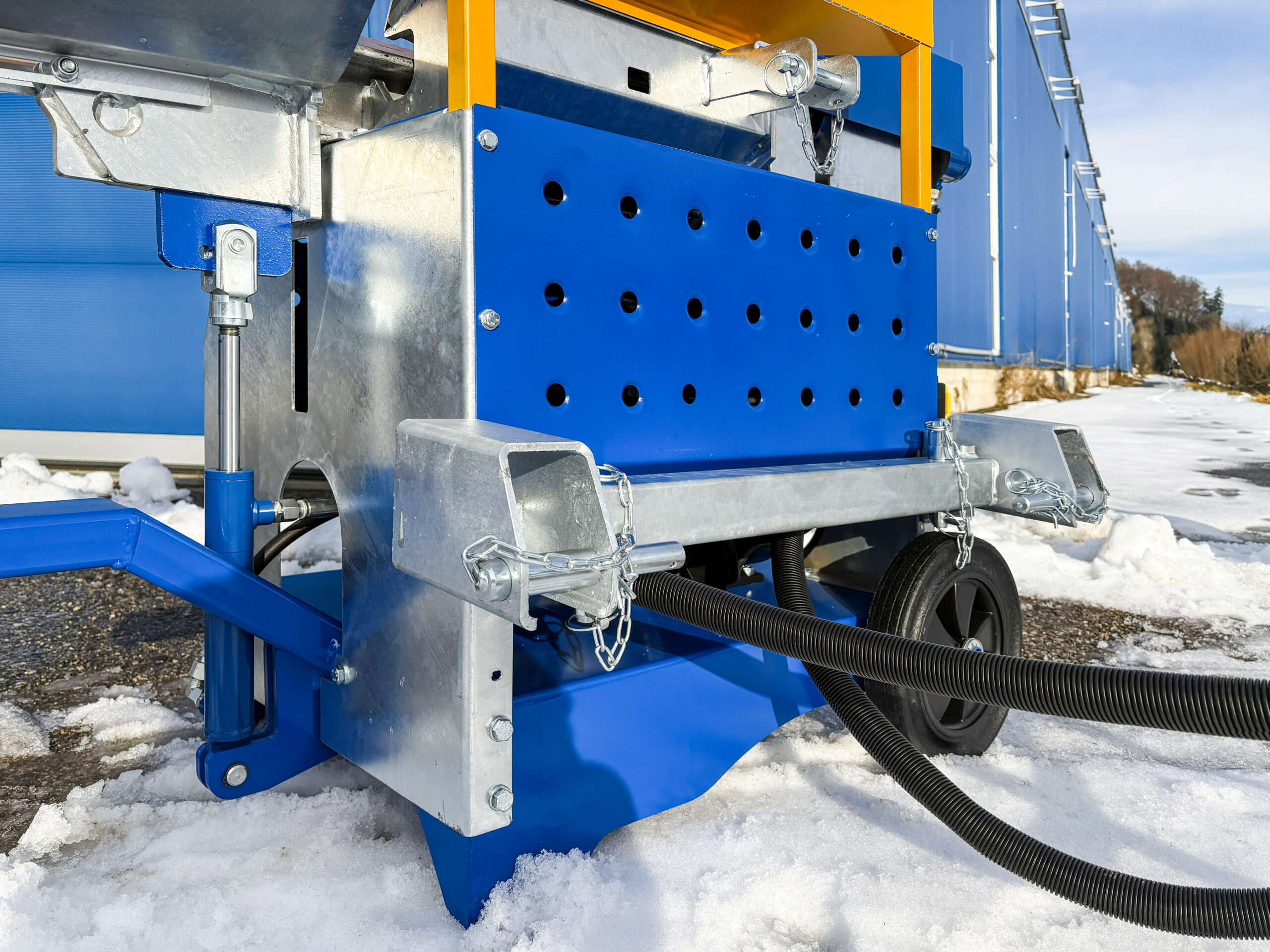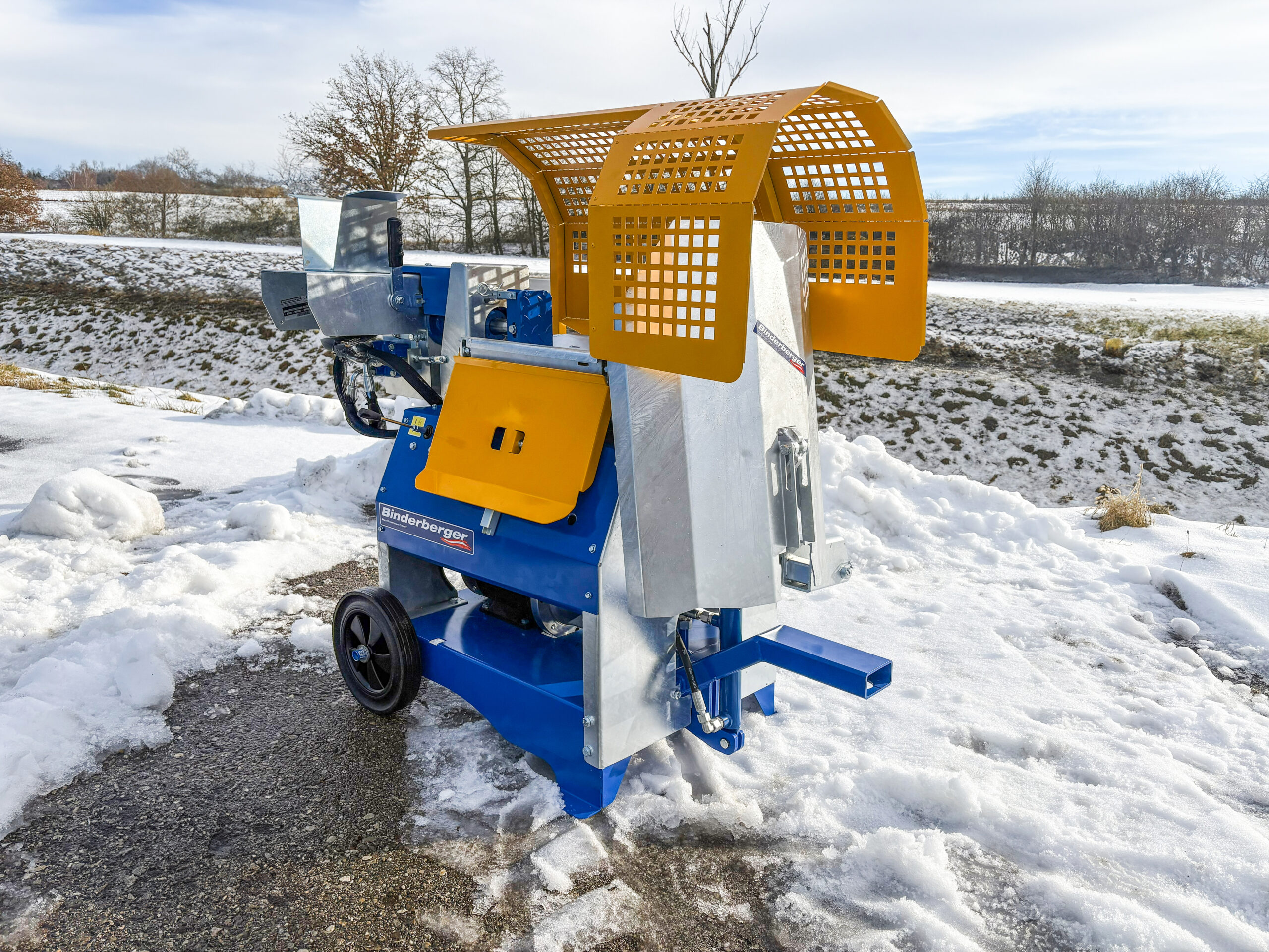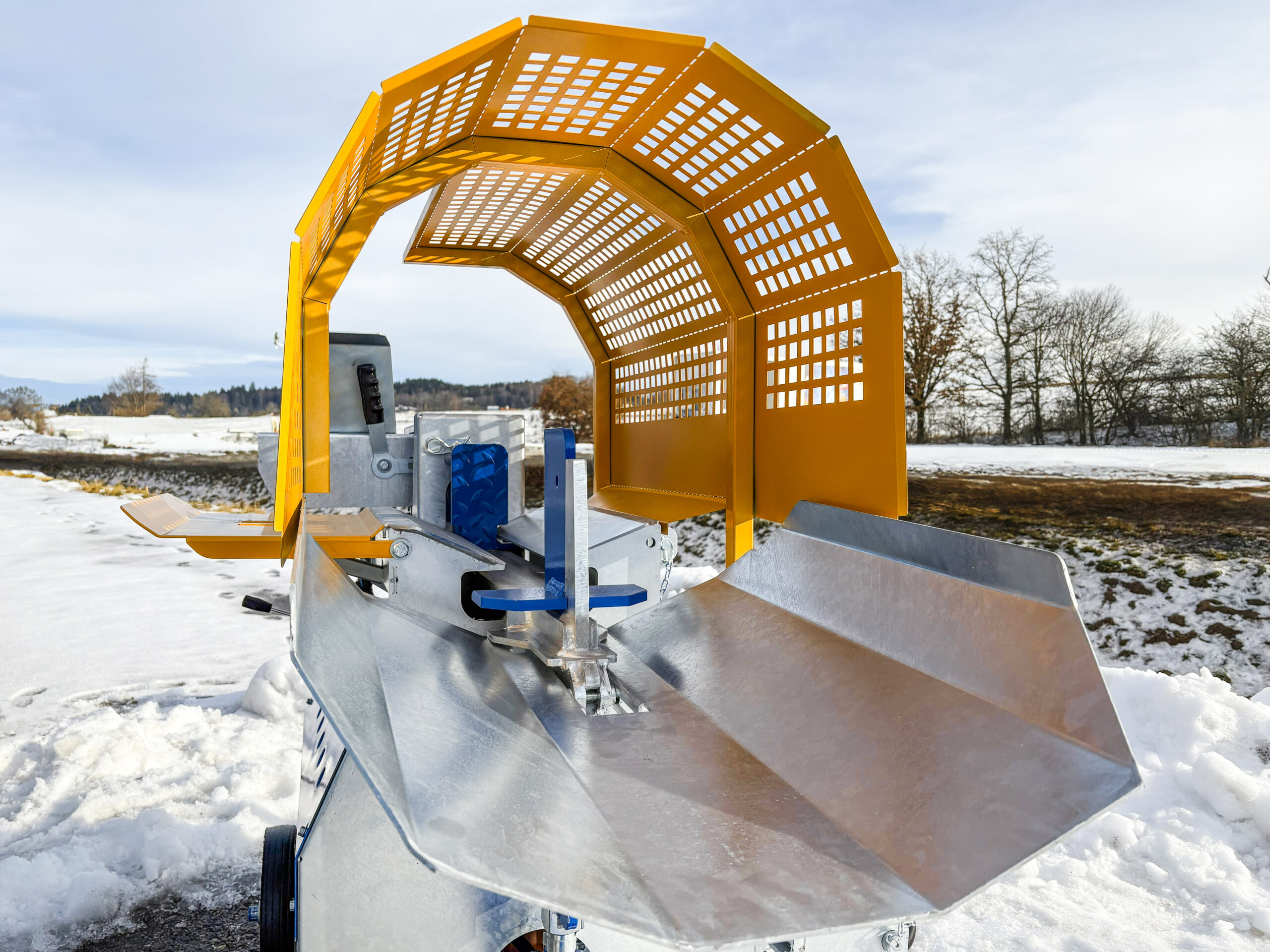 Durch die liegende Bauweise werden der Arbeitskomfort und die Sicherheit erheblich erhöht. Mit 8t Spaltkraft  erhältlich, wird das Holz durch das serienmäßige höhenverstellbare 4-fach Spaltkreuz gedrückt, wonach es auf der ausgeklappten Holzablage liegen bleibt. Damit das Spaltkreuz unseres Kurzholzspalter liegend keinen unnötigen Leerweg bis zum Anschlag fahren muss, ist der Hubweg begrenzbar und an die Brennholzlänge anpassbar.